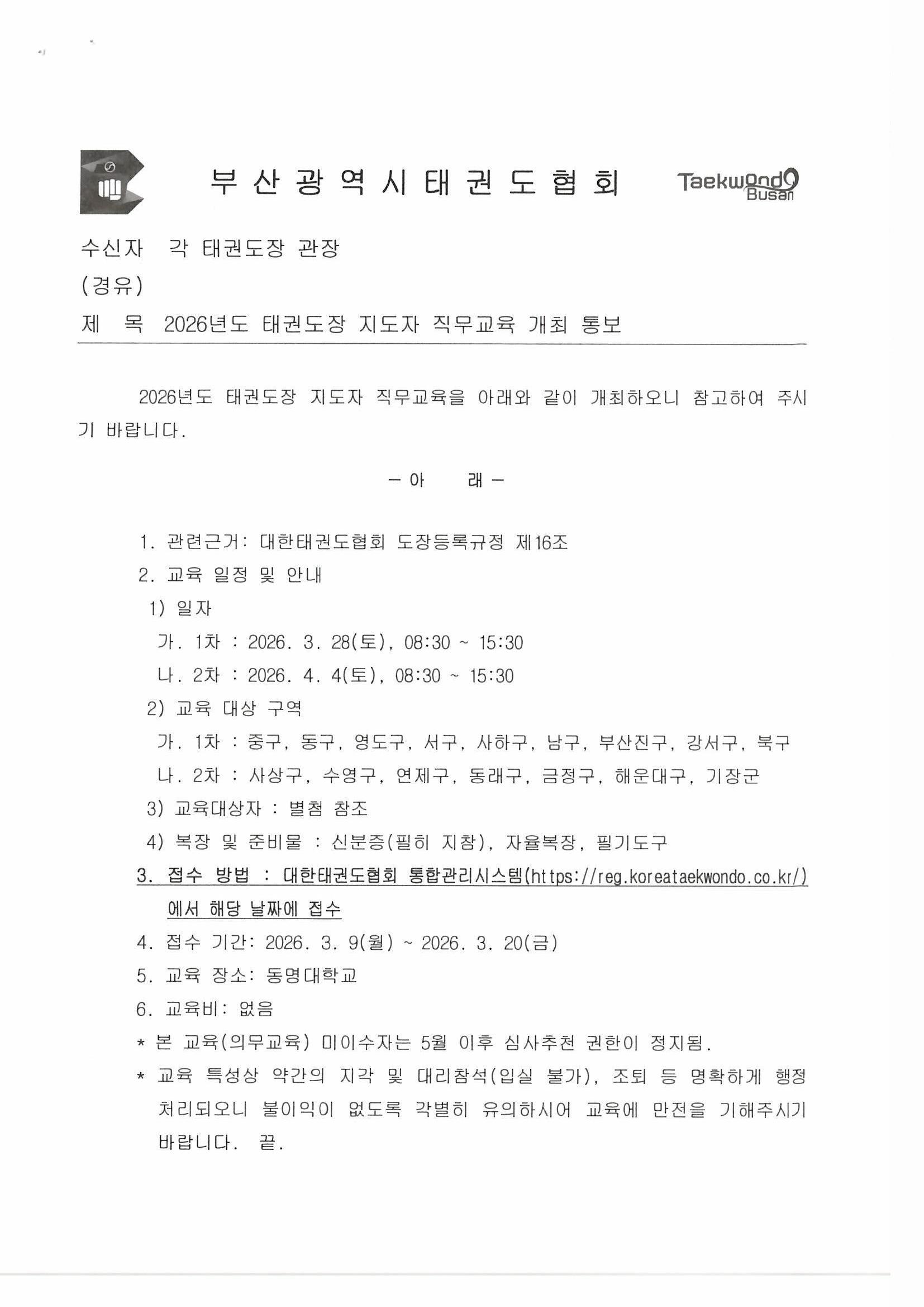- 2026년도 KTA 태권도장 지도자 직무교육 개최 통보