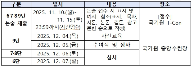 3. 논 제-6단: 장애인 태권도 수련 활성화를 위한 지도 방법을 논하시오.(비장애인과 장애인의 태권도 수련 차이점을 살펴보고 장애인 수련의 지도 방법 모색)-7단: 늘봄교육 및 방과후 교육 프로그램 시행에 있어 태권도장의 대응방안에 대하여 논하시오.(초등학교의 늘봄교육 및 방과후 교육프로그램을 살펴보며, 태권도장의 대응책을 모색)-8단: 취약 계층에 대한 태권도 활성화 방안을 논하시오.(노인, 다문화, 장애인, 저소득자 등 취약 계층이 태권도를 수련하는데 어려운 점 및 태권도를 통해 얻을 수 있는 강점을 살펴보고 취약 계층에 대한 태권도 활성화 방안 모색)-9단: 내 인생의 태권도 철학에 대해서 논하시오.(태권도 수련 시작배경 및 수련 과정을 통한 본인의 태권도 지도 철학과 태권도 수련가치 모색)-군.경.관(6.7.8단)- 직장(국방부, 경찰청) 내에서의 태권도 역할과 가치에 대하여 논하시오.(직장 내에서의 문제점을 살펴보고 문제해결을 위한 태권도의 역할 및 가치 모색)-논문접수 : 2025. 11. 10(월) ~ 11. 15(토) 23시59분까지(시간엄수)/T.02-3469-0141, 02-3469-0142~3(접수 마감 후 논술 미접수자는 담당자가 개별 통보)-접수방법 : 국기원 T-con-회원가입-승품단심사-고단자심사안내-논문제출*6,7,8,9단 재편성된 기본동작으로 평가되오니 참고바람.