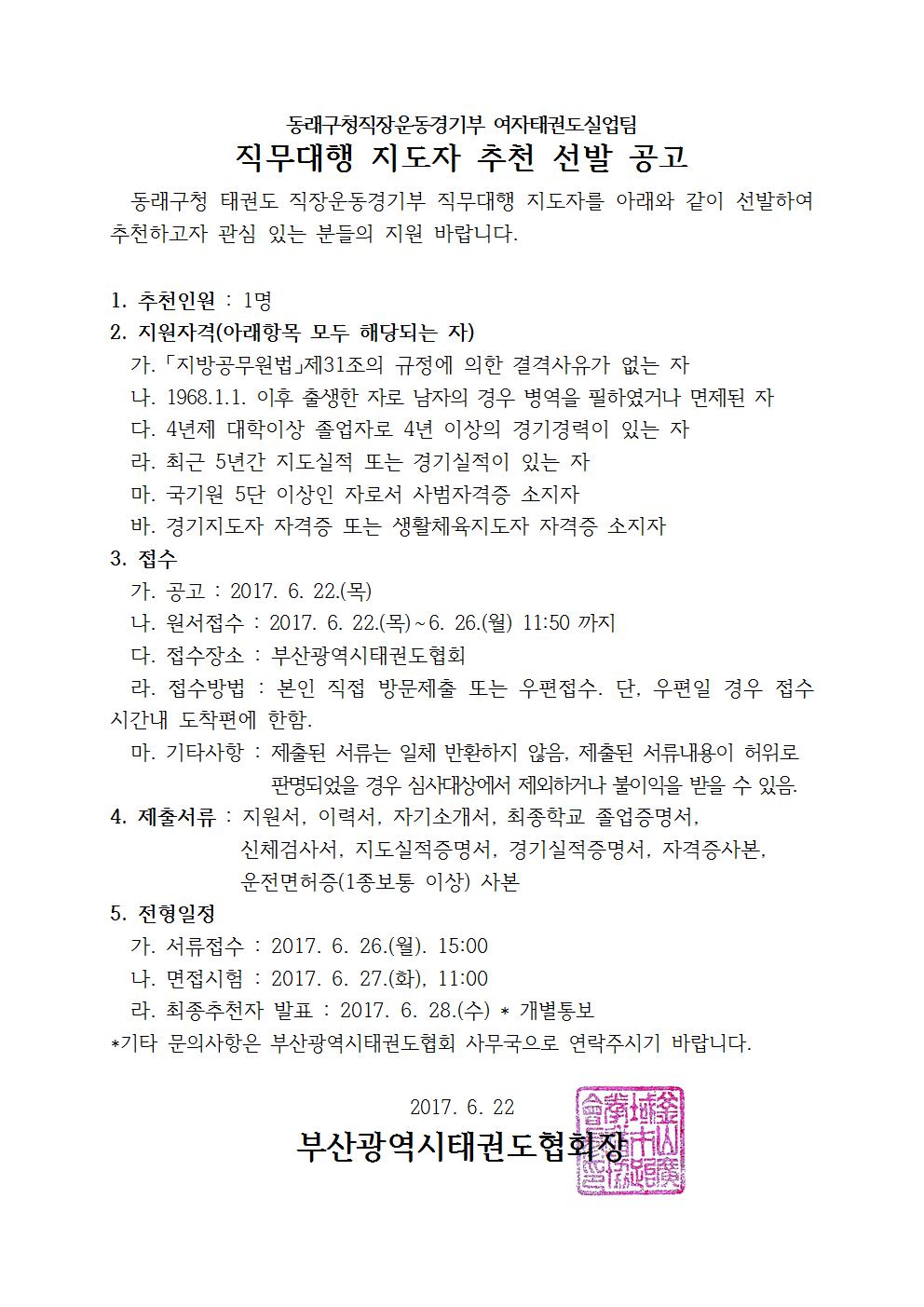 동래구청 직장운동경기부 직무대행 지도자 추천 선발 공고