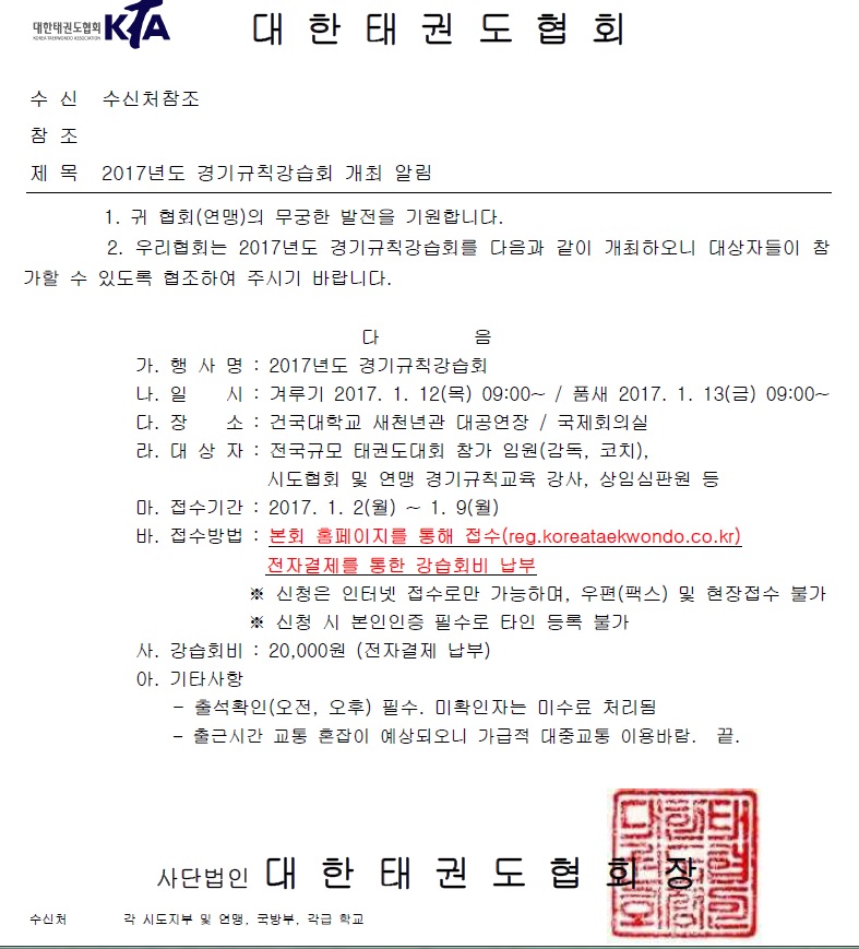 - (KTA) 2017년도 경기규칙강습회 개최 알림