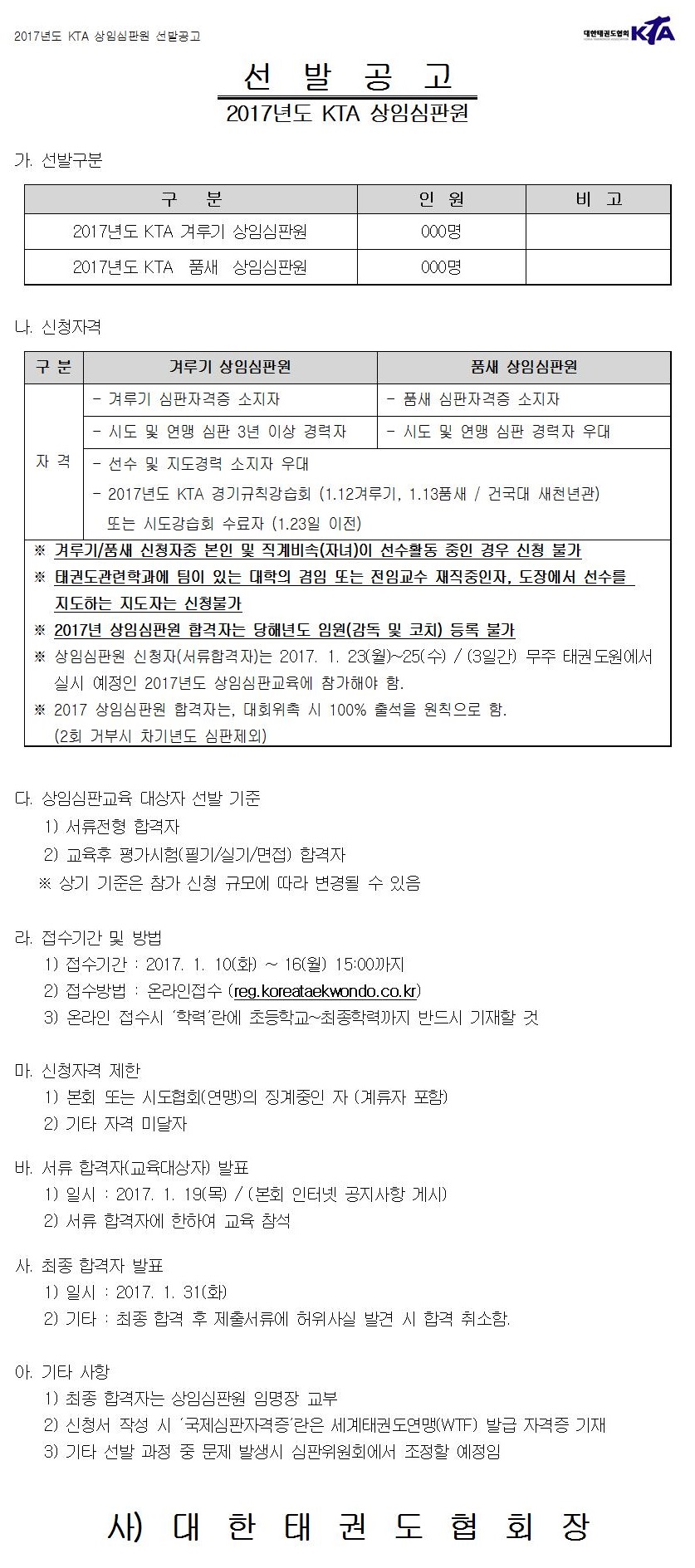 (KTA) 2017년도 겨루기.품새 상임심판원 선발 공고