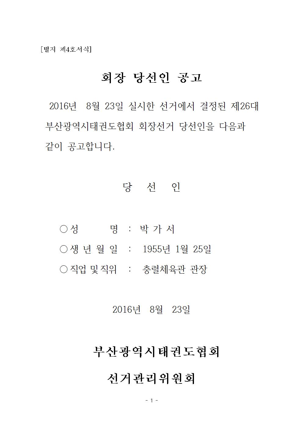 <선관위>제26대 부산광역시태권도협회 회장 당선자 안내