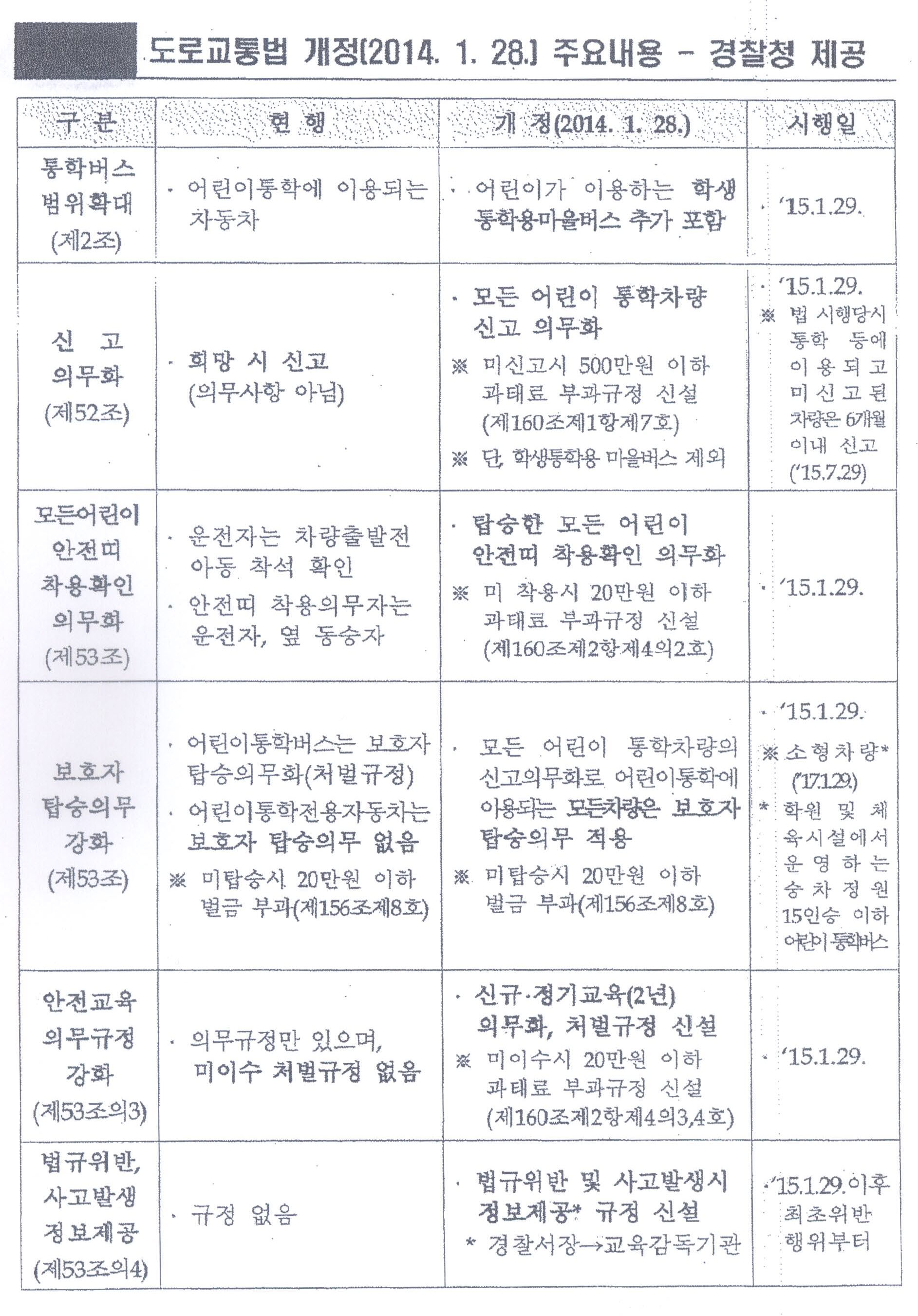 * 어린이 통학차량 교통사고 에방을 위해 통학차량 신고의무화, 안전띠 착용 의무화 등 통학차량 안전강화를 위한 도로교통법이 개정 공포(14.1.28)되어 '15.1.29부터 시행될 예정입니다.이에 따라 정부는 어린이통학차량전수조사 실시(14년 5월~6월), 각 언론매체를 홍보, 각 협회 공문발송 등 도로교통법 개정에 따른 통학차량 신고의무화 개정사항을 홍보 독려하고 있으나, 동 법에 대한 개정사항내용을 아직도 일선 체육시설(체육도장 등)에서는 인지하고 못하고 있는 경우가 많은 것으로 파악되고 있습니다.이와관련하여 어린이통학버스 안전강화대책이 조기에 정착하고 효과적으로 시행될 수 있도록 아래 사항에 대하여 적극 협조하여 주시기 바랍니다.