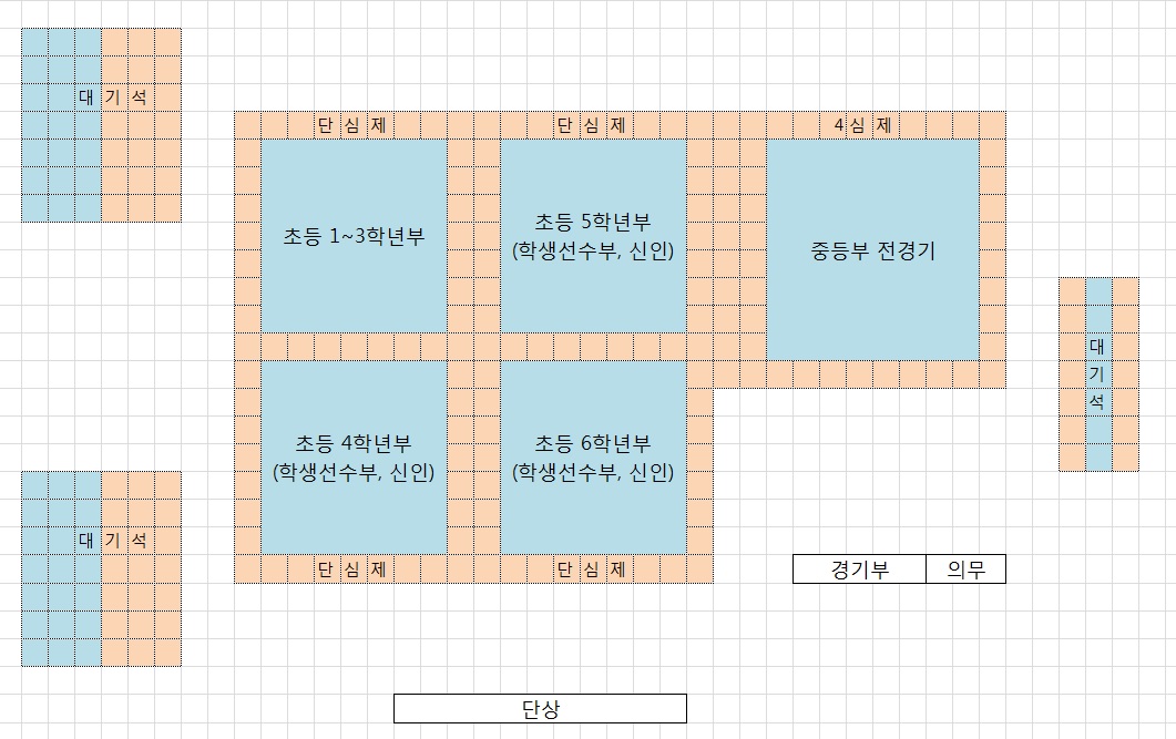 중등부 경기: 4심제 초등부 경기: 단심제 -초등부 경기는 학생선수부 경기가 종료된 후 신인선수부 경기가 진행됩니다. ![]() |
