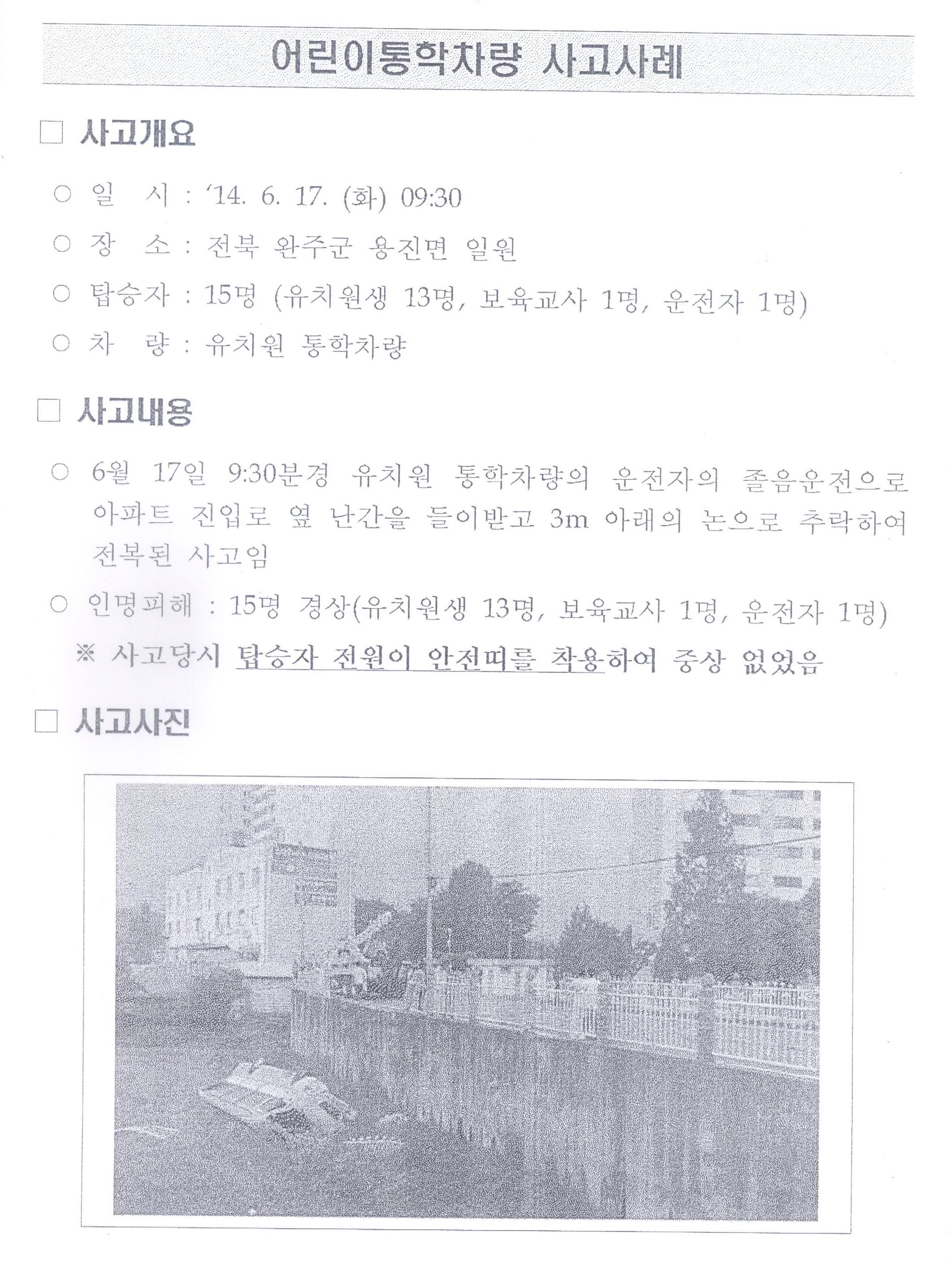 어린이 통학차량 교통사고 예방을 위해 통학차량 신고의무화, 안전띠 착용 의무화 등 통학차량 교통안전강화를 위한 도로교통법이 개정 공포(14.1.28)되어 '15년부터 시행예정입니다.이와 관련, '14년 6월 17일 전북 완주군에서 어린이 통학차량 전복사고가 있었으나 탑승 어린이 전원이 안전띠를 착용하여 대형 사고를 방지한 사례가 있어 알려드립니다.앞으로, 통학차량 탑승 시 어린이가 안전띠를 반드시 착용할 수 있도록 체육도장에 동 사례를 홍보하여 주시기 바랍니다.아울러 문화체육관광부는 어린이 통학차량 정보 입력 협조요청(2014.5.9) 드린바 있으나, 현재 타 업종 대비 체육시설의 입력이 매우 저조한 바 각 지역 협회 및 체육도장에 홍보 및 협조를 요청드리는 바입니다.O 대 상 : 통학차량 운행 시설만 어린이 통학차량 안전관리시스템에 입력* 입력방법 메뉴얼은 어린이통학 관리시스템 사이트에 게시(입력문의: 학교안전공제중앙회 070-7996-0147)O 입력사이트: ((https://schoolbus.ssif.or.kr/(어린이 통학차량 관리시스템))O 방 법 : 어린이 통학차량 안전관리시스템에 입력O 입력내용 : 시설정보, 차량정보, 차량 보험정보, 어린이 통학차량의 신고정보, 시설 운영자 및 운전자에 대한 교육 정보 등* 기 입력시설은 추가 변동사항만 입력.수정* 동 입력은 도로교통법 상 신고와의 별개로 실태파악을 위한 기초 조사임붙임: 어린이 통학차량 대형사고 방지사례