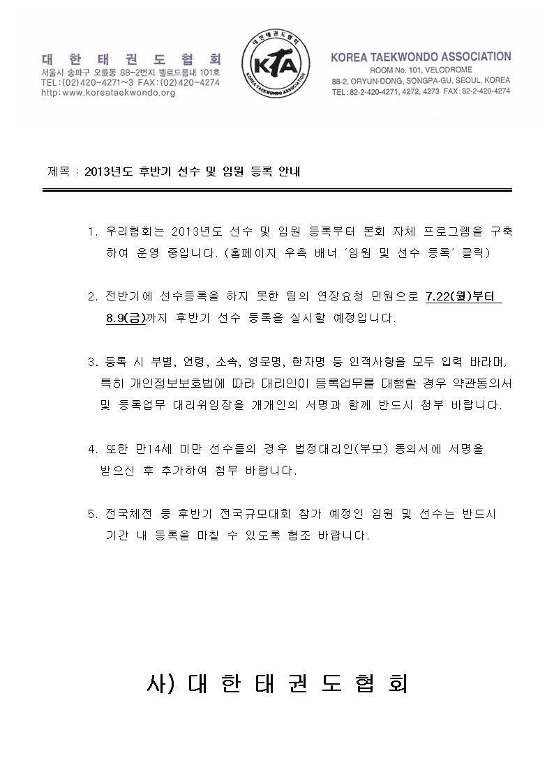 KTA) 2013 후반기 선수 및 임원 등록 안내