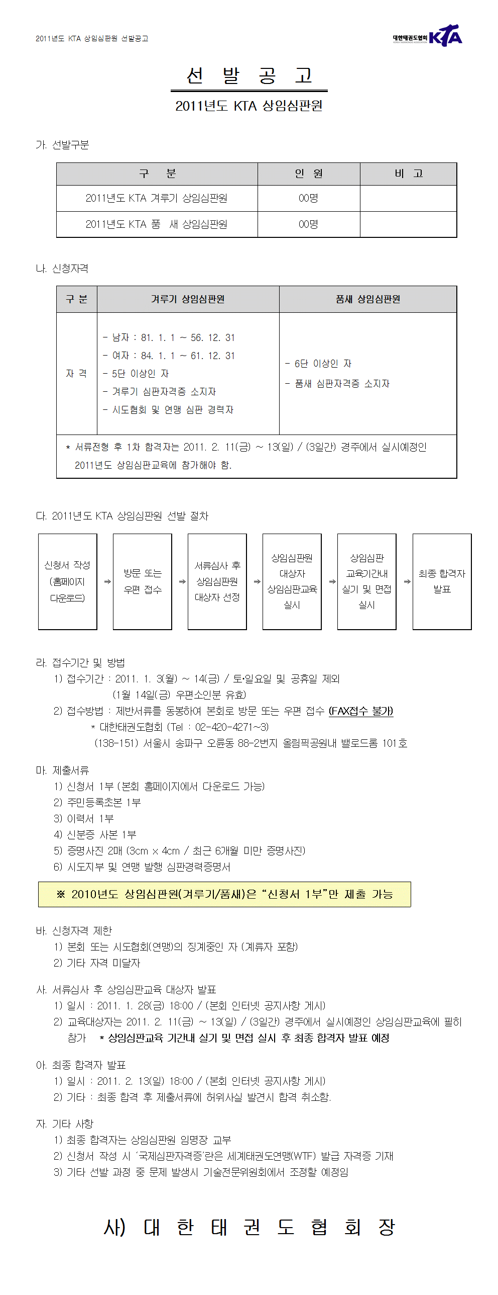 2011년도 KTA 겨루기.품새 상임심판원 선발 공고