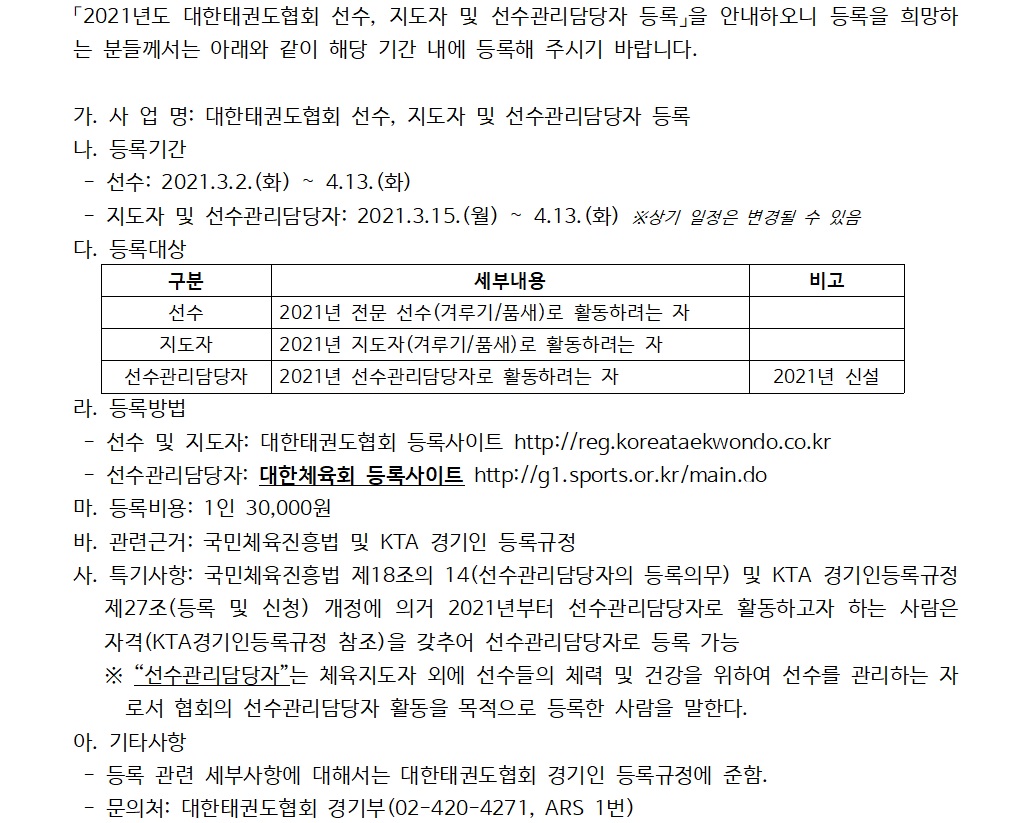 (KTA) 선수, 지도자 및 선수관리담당자 등록 알림