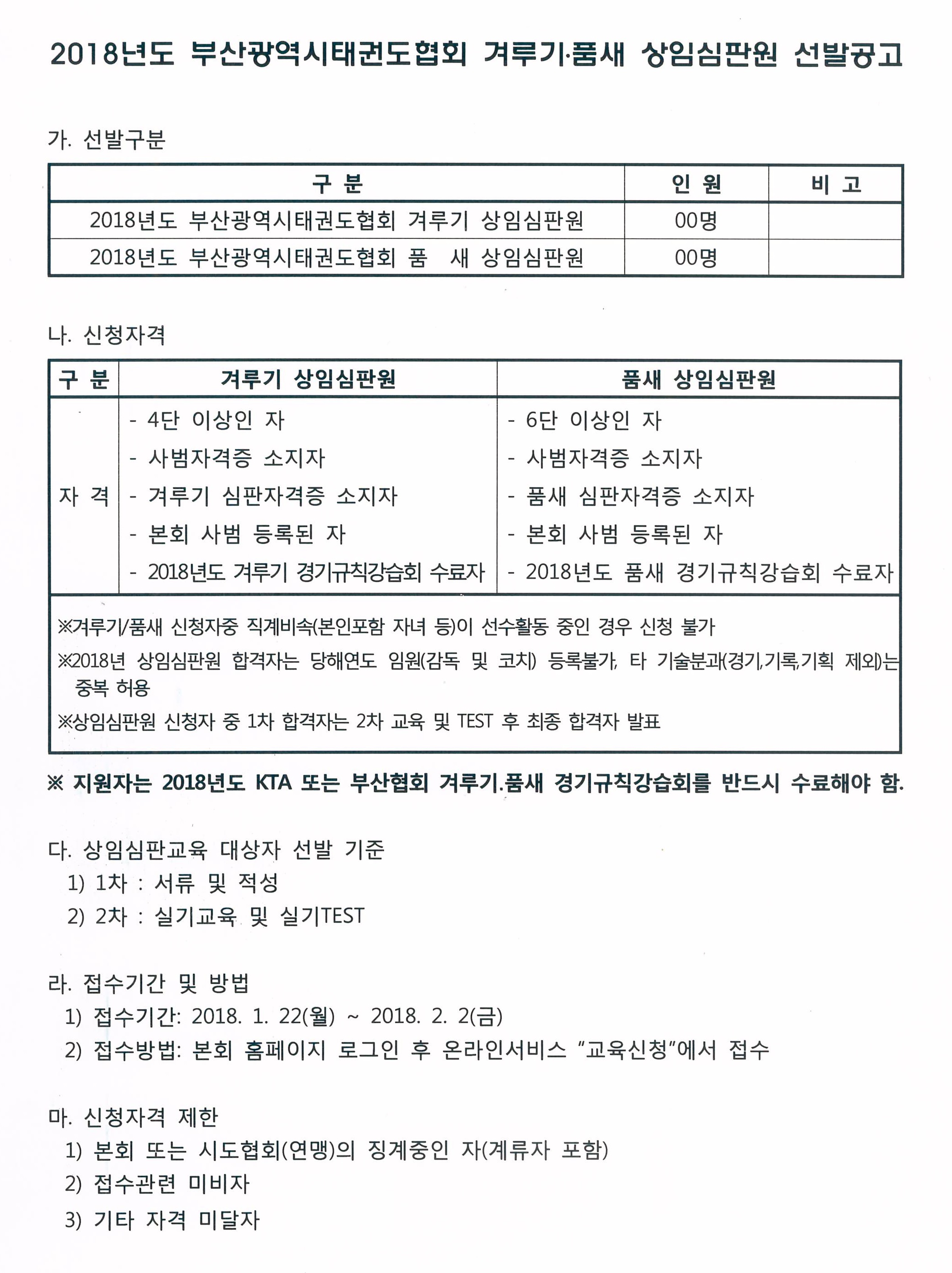 2018년도 부산 겨루기.품새 상임심판원 선발 공고